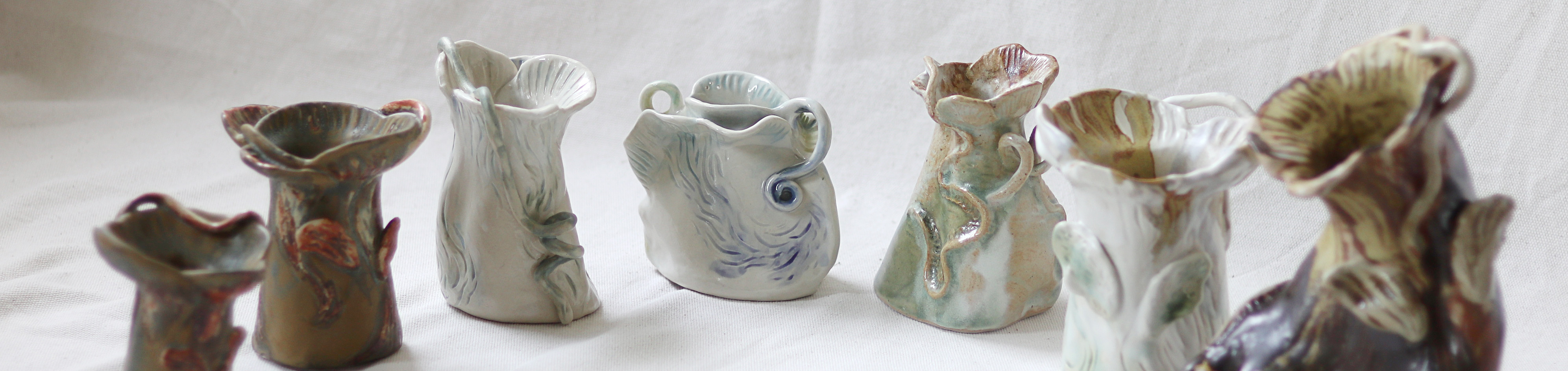 These pieces take the form of vertical vessels that slowly evolve into blooming flowers. Each vessel carries vines that branch out in different directions. They move from shorter to taller forms, marking the starting point of change and the quiet progress of becoming.